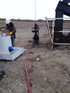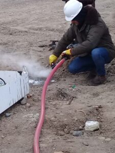 Módulo Generador de Vapor ELÉCTRICO de 200kW Marca FLOWING, operando en los campos petroleros de Comodoro Rivadavia. Inyectando vapor en los pozos se logra bajar la viscosidad del crudo, permitiendo reducciones importantes en el consumo de energía y minimizando la rotura de los equipos de bombeo. También utilizado para limpieza de máquinas y equipos permite reducir el consumo de agua.