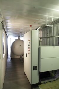 El módulo petrolero de vapor FLOWING cuenta con un tanque de 10.000 litros de agua, sistemas de bombas y un sistema para el tratamiento de agua, un GENERADOR DE VAPOR ELECTRICO FLOWING de 200kW FES200, PLC con sistema de comunicación con la base y sistemas de seguridad, todo integrado en un Contenedor móvil. INDUSTRIA ARGENTINA.
